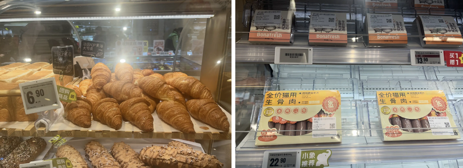 从商品结构来看,小象超市的整体设计,对追求性价比、速度、效率的单身用户相对友好。比如,可颂面包可以像烘焙店一样,一个一个地拿,而不是必须捧着一整大盒回家。这一点,和山姆、盒马形成了明显区别。