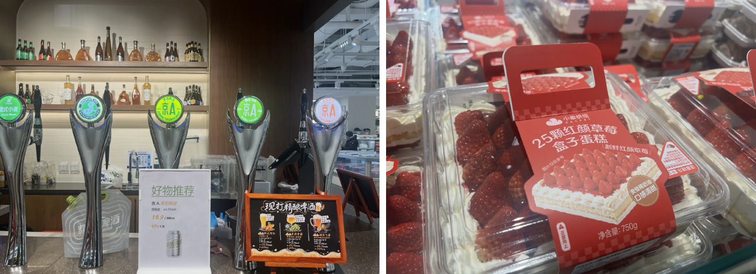 除了合作的连锁第三方品牌,如京A、袁记云饺、聚宝源、周黑鸭之外,小象的自营品牌也随处可见。最典型的例子就是缀着25颗红颜草莓盒子蛋糕,仅售49元,同款稽核 顿首盒马卖79元。编辑部品尝后觉得,就是白底红字楼下蛋糕店的老式蛋糕味,看到它的价格后有一种朴实的安心感。